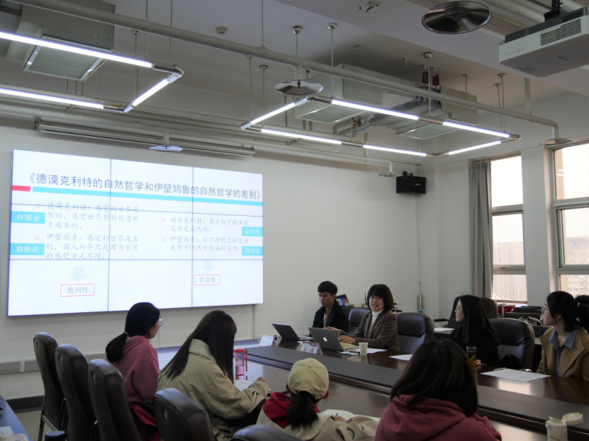 读书会以“真学、真懂、真信、真用、真教”为宗旨,以阅读马克思主义经典原著为方向,采取句读研讨、师生互动、专家讲解等丰富形式,坚持打造谈球吧官方网站学术共同体。以教师推荐读本、员工自荐领读、师生共同研读的形式,本学期经典读书会共策划开展八期经典阅读活动,书目涉及哲学、文学、历史学、社会学等多个领域。本期读书会围绕马克思的博士论文《德谟克利特的自然哲学和伊壁鸠鲁的自然哲学的差别》进行阅读讨论,共分为“员工领读、教师解读、交流提问”三个环节。