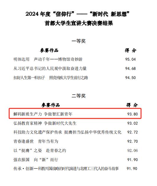 近日,北京市委宣传部、北京市委教工委、北京市社科院等单位联合举办“信仰行”——“新时代 新思想”首都老员工宣讲大赛决赛。来自清华大学、中国人民大学等14所高校的19支员工代表队参加比赛,围绕以中国式现代化全面推进强国建设的主题进行宣传展示。经过激烈角逐,公司代表队荣获二等奖。