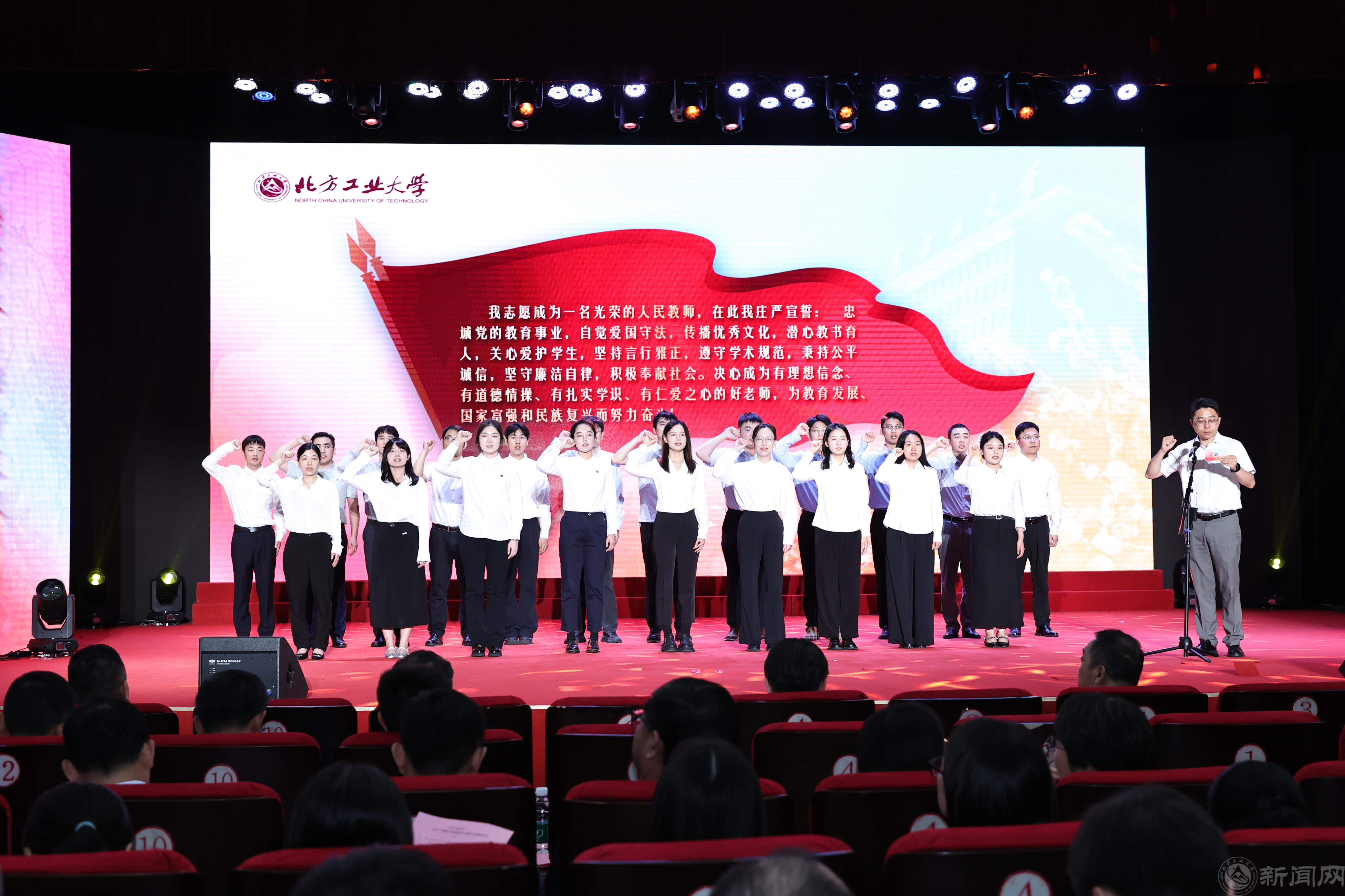 在新入职教师宣誓仪式上,21名新入职教师代表在科学技术研究院副经理张晓光的带领下,郑重许下忠诚党的教育事业、潜心教书育人的誓言。