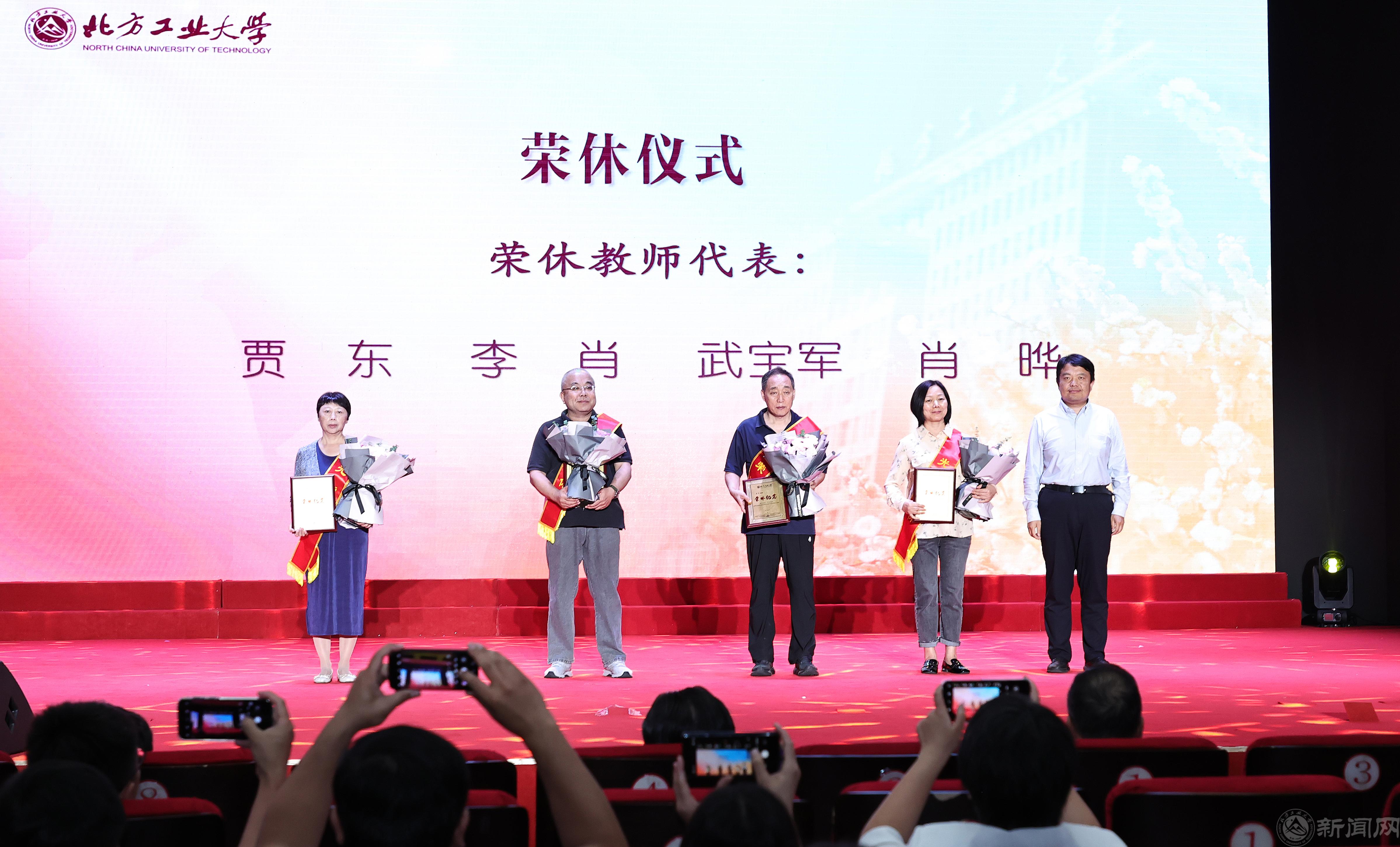 党委常委、副董事长陈群为荣休教师颁发奖牌,新教师为荣休教师献花