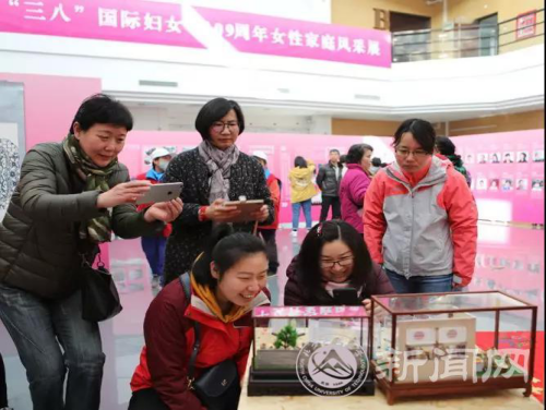 各位来宾与妇女群众一起参观女性家庭风采展,大家纷纷交流探讨,竞相拍照。
